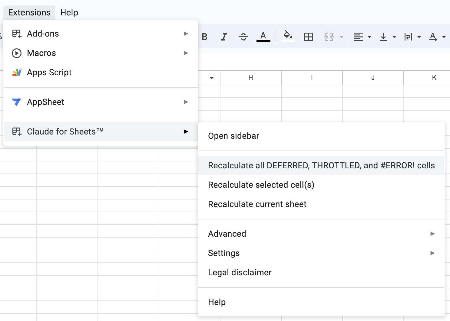 You can manually recalculate #ERROR!, ⚠ DEFERRED ⚠ or ⚠ THROTTLED ⚠cells by selecting from the recalculate options within the Claude for Sheets extension menu.